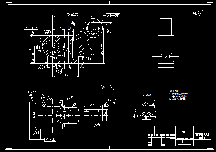 本设计所设计的零件是柴油机中摇臂结合部的气门摇臂轴支座,它是柴油机上气门控制系统的一个重要零件。直径为18mm的孔用来装配摇臂轴,轴的两端各安装一进、排气气门摇臂。直径为16mm的孔内装一个减压轴,用于降低汽缸内压力,便于启动柴油机。两孔间距56mm,可以保证减压轴在摇臂上打开气门,实现减压。两孔要求的表面粗糙度和位置精度较高,工作时会和轴相配合工作,起到支撑的作用,直径11的孔用M10的螺杆与汽缸盖相连,直径3的孔用来排油,各部分尺寸零件图中详细标注。