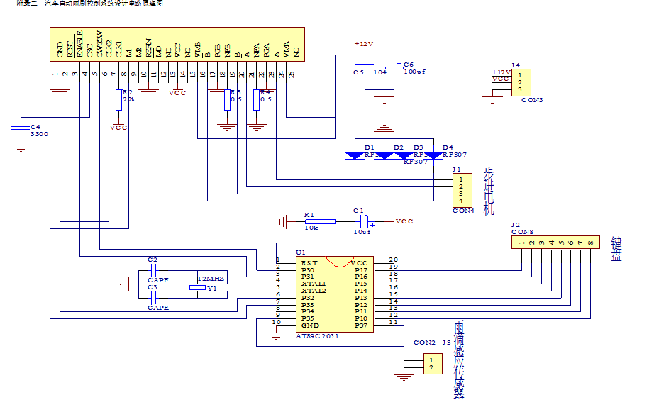 本次设计的汽车自动雨刷控制系统是基于AT89C51单片机、汽车雨量传感器和雨刷电机并通过软硬件的设计综合实现的。而且本系统中采用步进电机取代传统的雨刷电机(传统雨刷电机为直流电机),目的是运用步进电机控制精度高等特点,使系统更加的稳定可靠。本次设计也综合应用之前学校所学的单片机、微机控制、电路设计、电机拖动等方面的知识,进一步了巩固我们的本专业知识。考虑到设计成本,设计运用的这些材料相对于其他同类产品价格非常底。此次设计中我们采用了单片机系统的微处理器AT89C51芯片、TA8435H步进电机驱动芯片等硬件,而且它们具有集成化,智能化,高精度,高性能,高可靠性和低价格等优点。所以汽车自动雨刷控制系统是个值得推广的一种方法,且具有很好的市场推广价值。