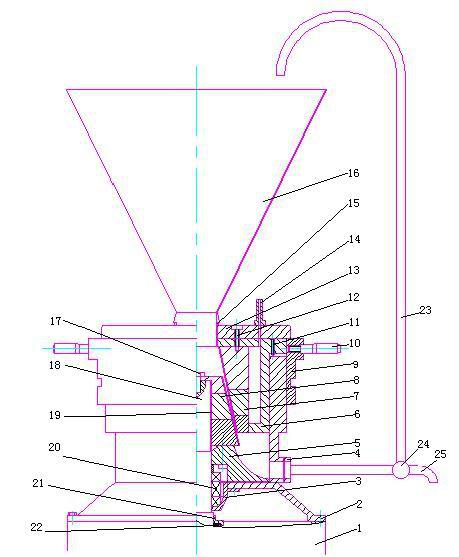 The utility model has the advantages of simple and compact structure, strong practicability, convenient installation, disassembly and maintenance, and small size of each structure. The grinder roll in flat, the feeding performance is good; the feed flow directly into the grinding zone, and be convenient for the operator to observe and adjust the feeding condition; the crushed materials for grinding the door without dusting, convenient replacement of grinding roller. The large belt pulley and the synchronous belt wheel on the roller shaft adopt elastic connection, and the assembly and disassembly are convenient. The grinding roller is driven by double arc source synchronous belt, and the change to the tension wheel as a modification to the tensioner, the structure is simple and compact, catch up with the international advanced level. In this paper, the design method of vertical colloid mill is studied, and its working principle, structural characteristics, transmission system and main technical parameters are introduced. The design of main parts is designed by the combination of design and improvement. This paper not only completed the task of design expected, and made great improvement, and disc main parts are the use of high-quality stainless steel, not only solve the surface abrasion faults, but also more in line with the hygiene requirements; in addition this paper also designs the general colloid mill does not have the cooling device and circulation device. To become a better product.