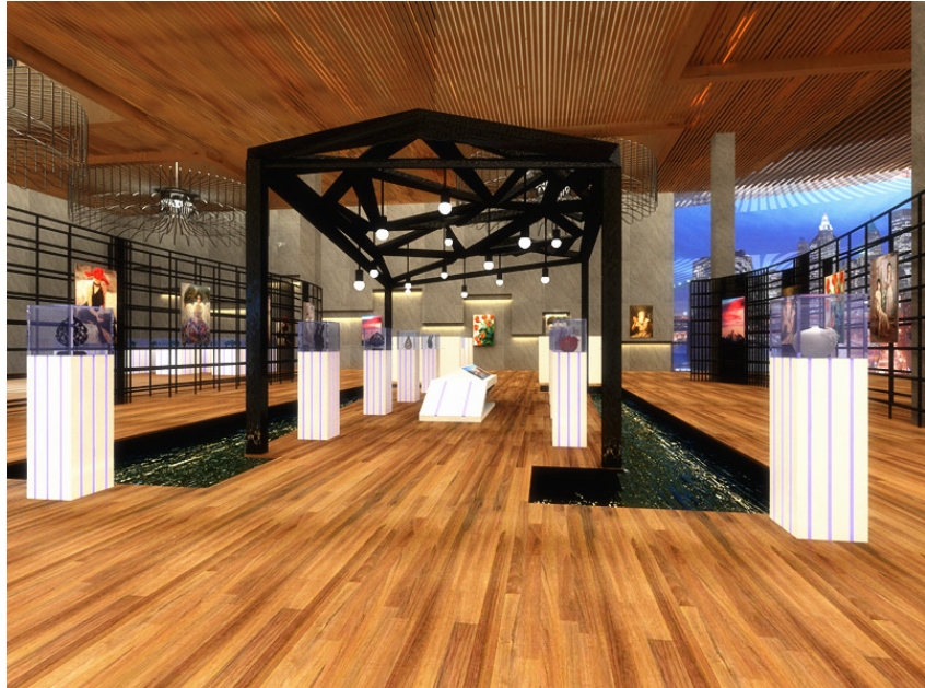 灯光照明上:在整个画廊展示设计中水平照明得到了应用,对于站台或者大型的水平展品,为了达到整体展示的效果,需要空间内的大面积照明。对于高大的展示空间,在本次设计中使用了悬吊式灯具。在画廊展示设计中采用了方向性照明,此举是为了加强展品的重点照明,解释展品的细节部分或塑造展品的立体感。